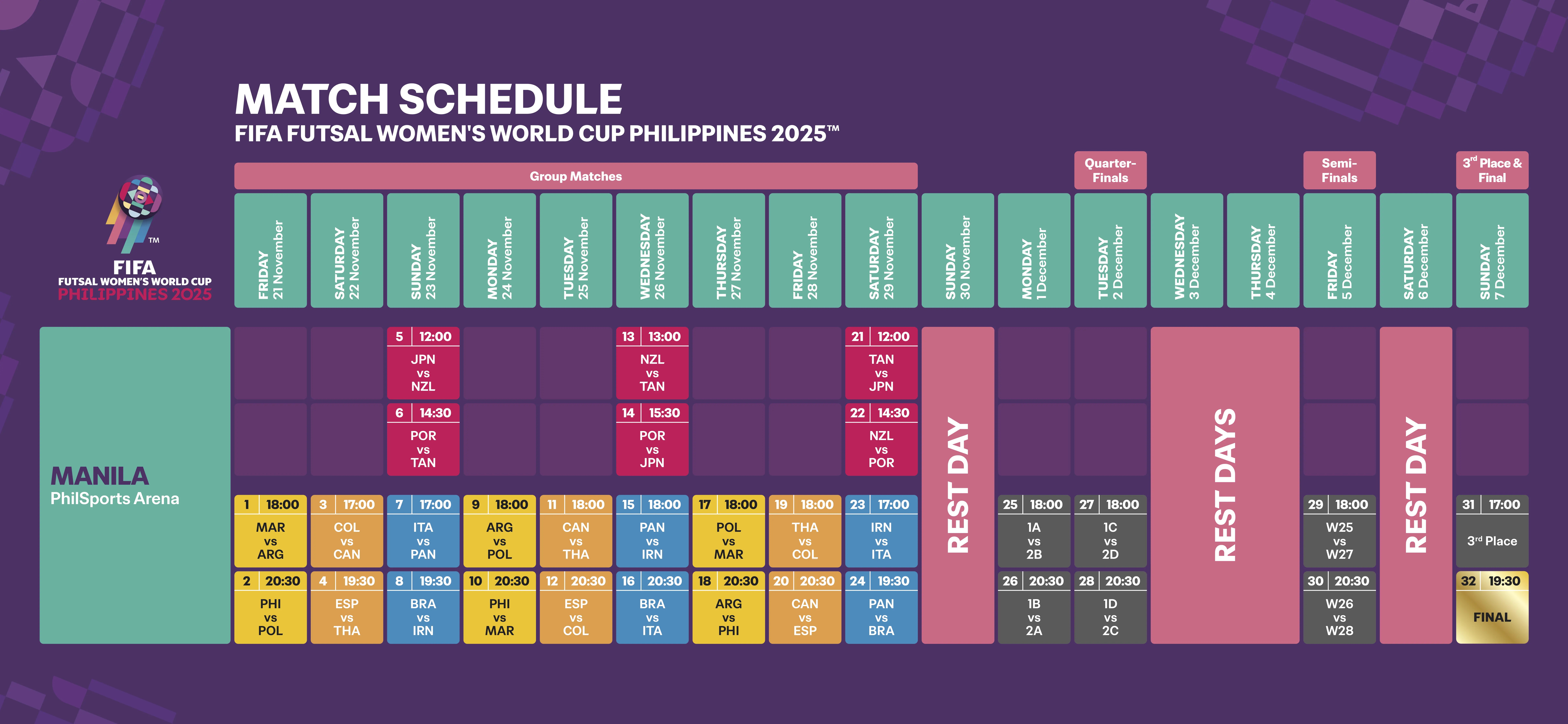 FIFA 女子フットサル・ワールドカップ フィリピン2025 フィリピン(開催国)、ポルトガル、イタリア、スペイン、ポーランド、日本、タイ、イラン、モロッコ、タンザニア、カナダ、パナマ、ブラジル、アルゼンチン、コロンビア、ニュージーランド 大会スケジュール |
