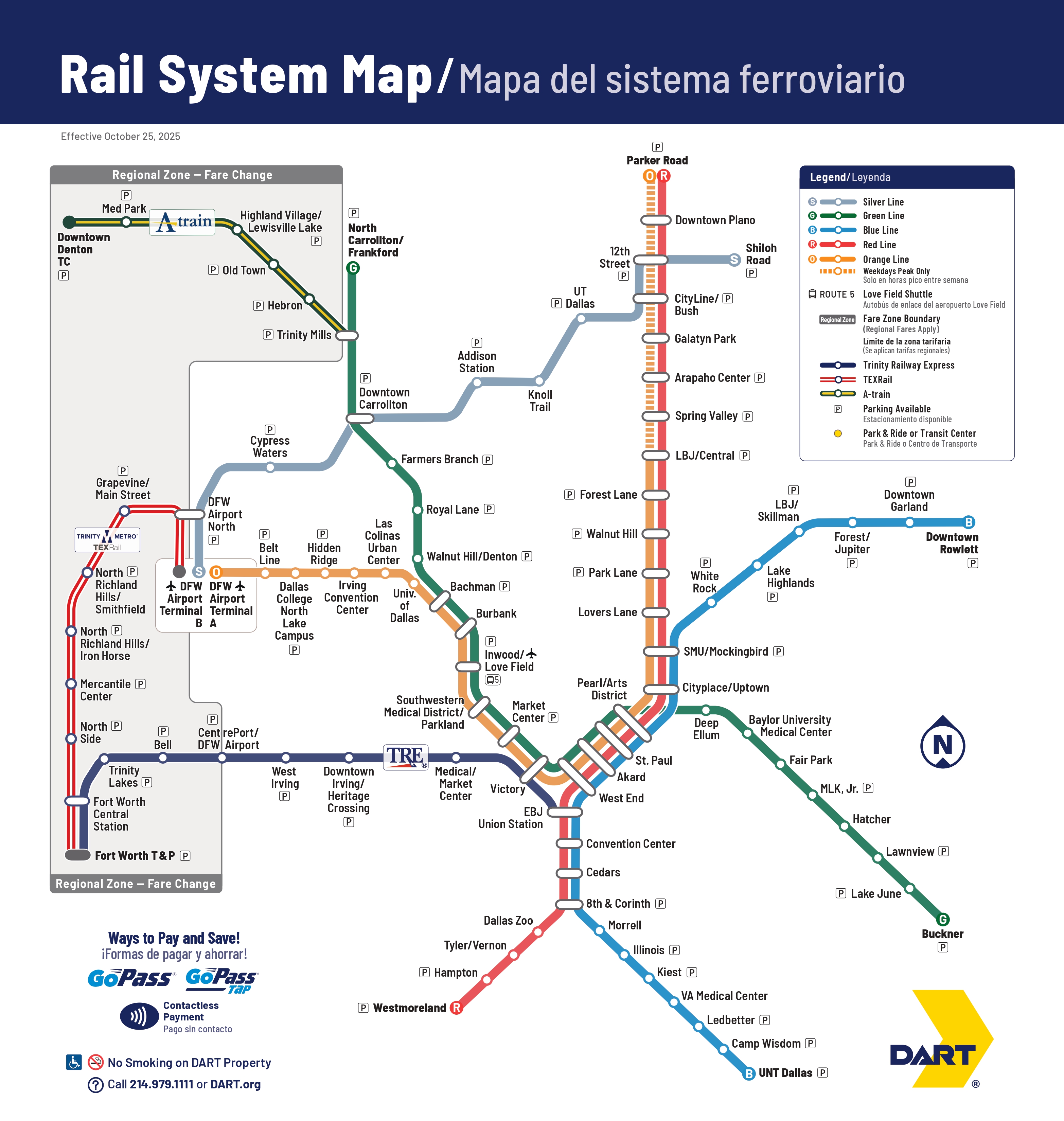 ダラス市内とダラス・フォートワース国際空港、フォートワースを結ぶDART(Dallas Area Rapid Transit)が整備されています。DARTは全長93マイル(約150km)で、米国最長のライトレールシステムの一つです。レッド、ブルー、グリーン、オレンジの4路線を有し全路線がダラス中心部を通過します。