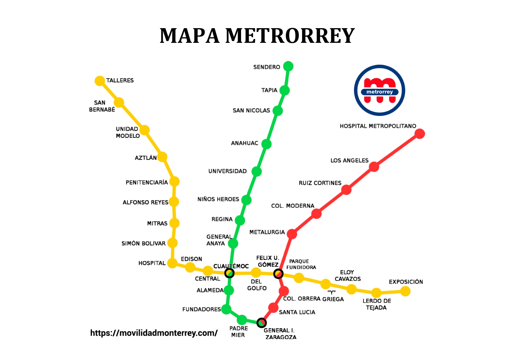 メトロ=Metrorreyは高速交通システムで、主に高架または地下を走る3路線(1号線、2号線、3号線)があり年間1億3800万人以上が利用しています。